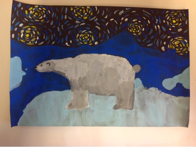 3rd graders are finally finishing up their polar bear projects! This one has taken a while to complete! We started with the polar bear drawing. Then we practiced shading on our bears with gray and white paint, and making the fur with short choppy brush strokes. A beautiful starry night sky tops off these awesome winter scenes!